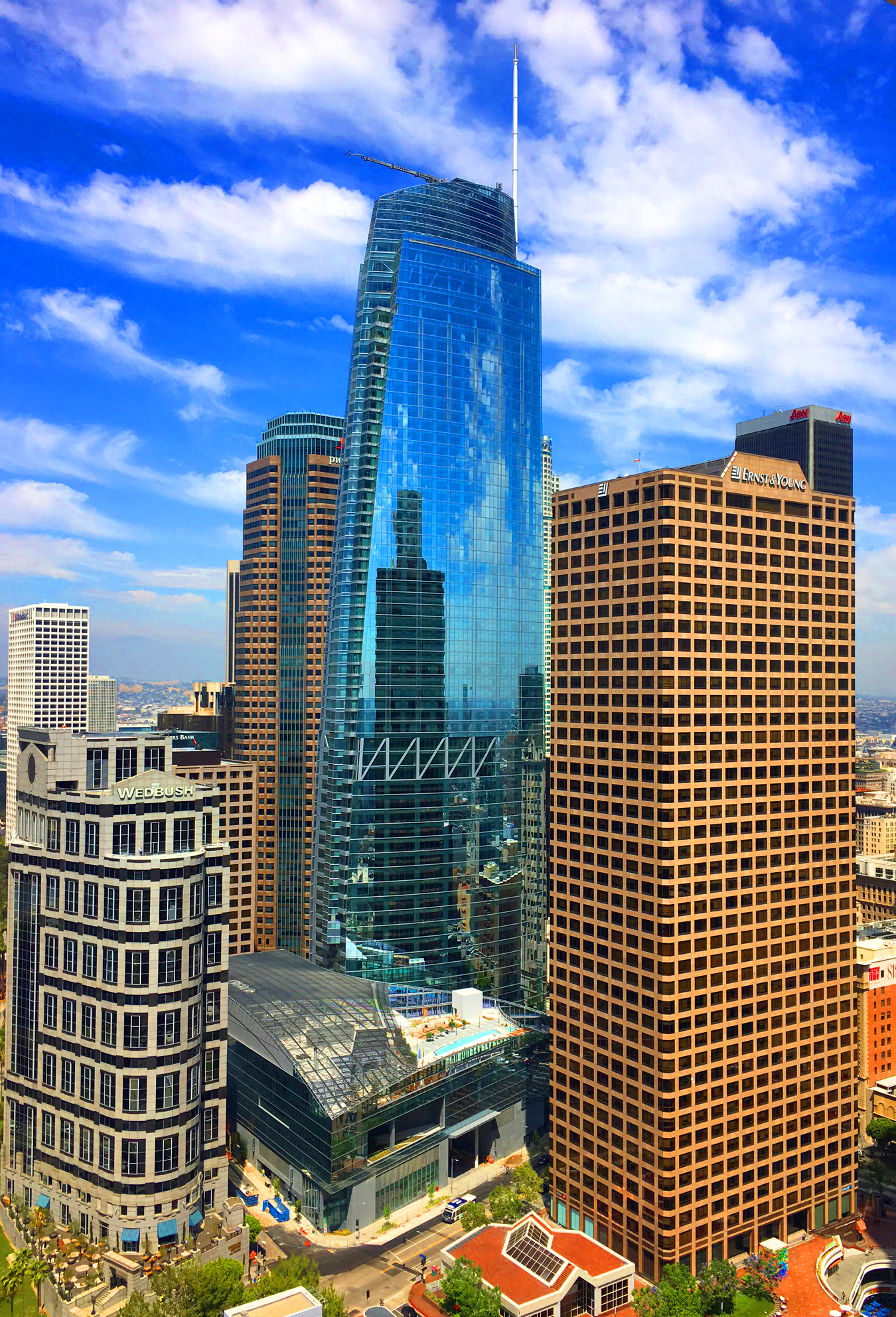 The building is part of a mixed-use hotel, retail, observation decks, shopping mall, and office complex, expected to revitalize downtown Los Angeles and the area surrounding the building.